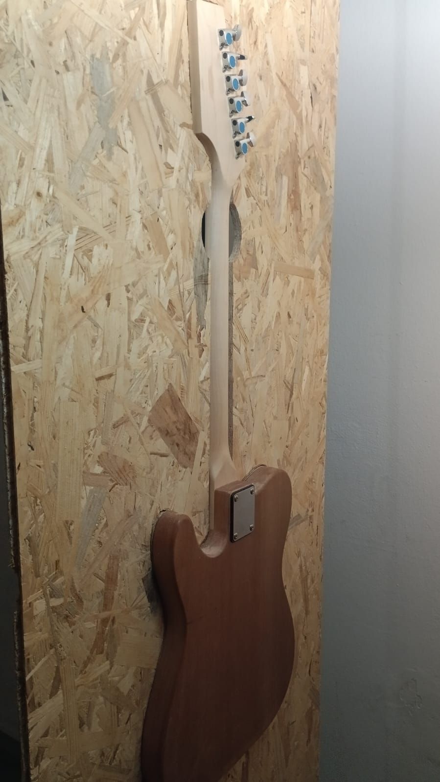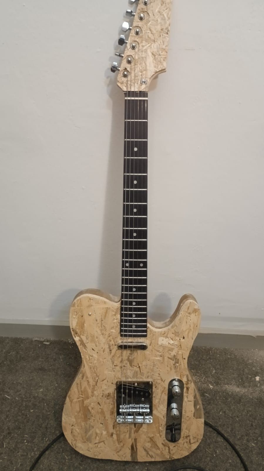 Die Wahl des Holzes ist bei E-Gitarren nur eine Frage der Optik. Wölcken-Ahorn, karamelisierter Esche, Wurzelholz mit Mycel-Intarsien, alles ist möglich. Dabei ist weniger oft mehr, in diesem Fall sogar ein bisschen viel. Statt einer sorgsam ausgewählten Maserung besteht die Decke dieser Telecaster (nein, kein Original) aus OSB. Die Platte, aus der die Decke für Korpus und Kopf gesägt wurden, dient gleichzeitig als Halter. Damit verschwindet die aufgehängte Gitarre wieder in der Struktur der Platte, und nur der Hals und die Blechteile bleiben sichtbar.
